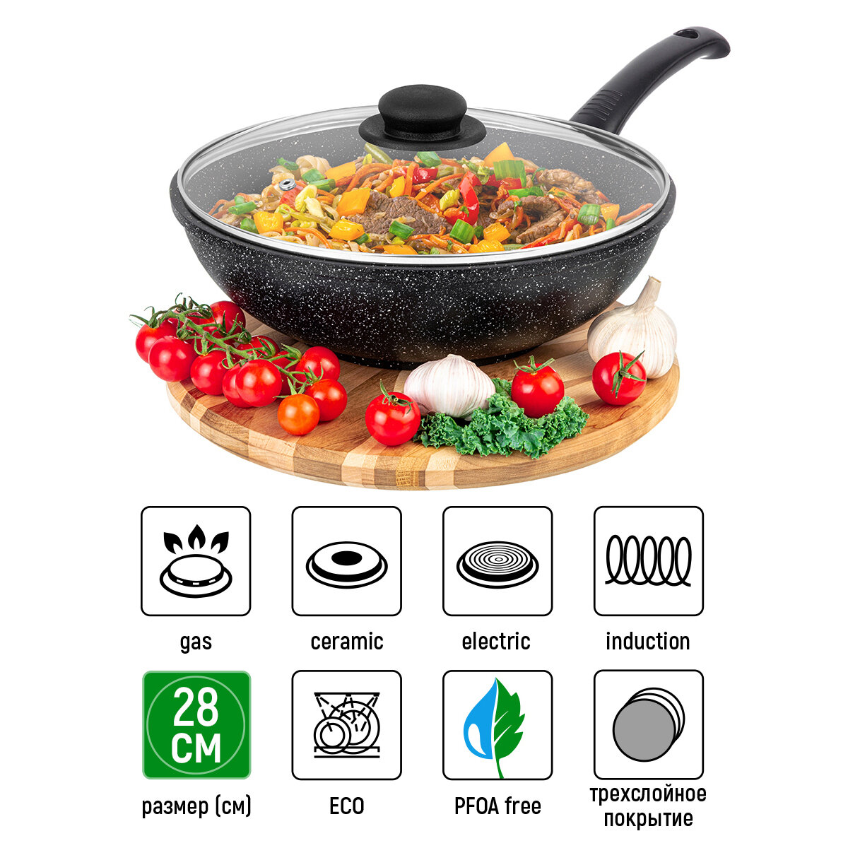 Сковородка Сковорода ВОК 28 см Elan Gallery гармония вкуса Черный мрамор индукция, с крышкой D28, с несъёмной ручкой