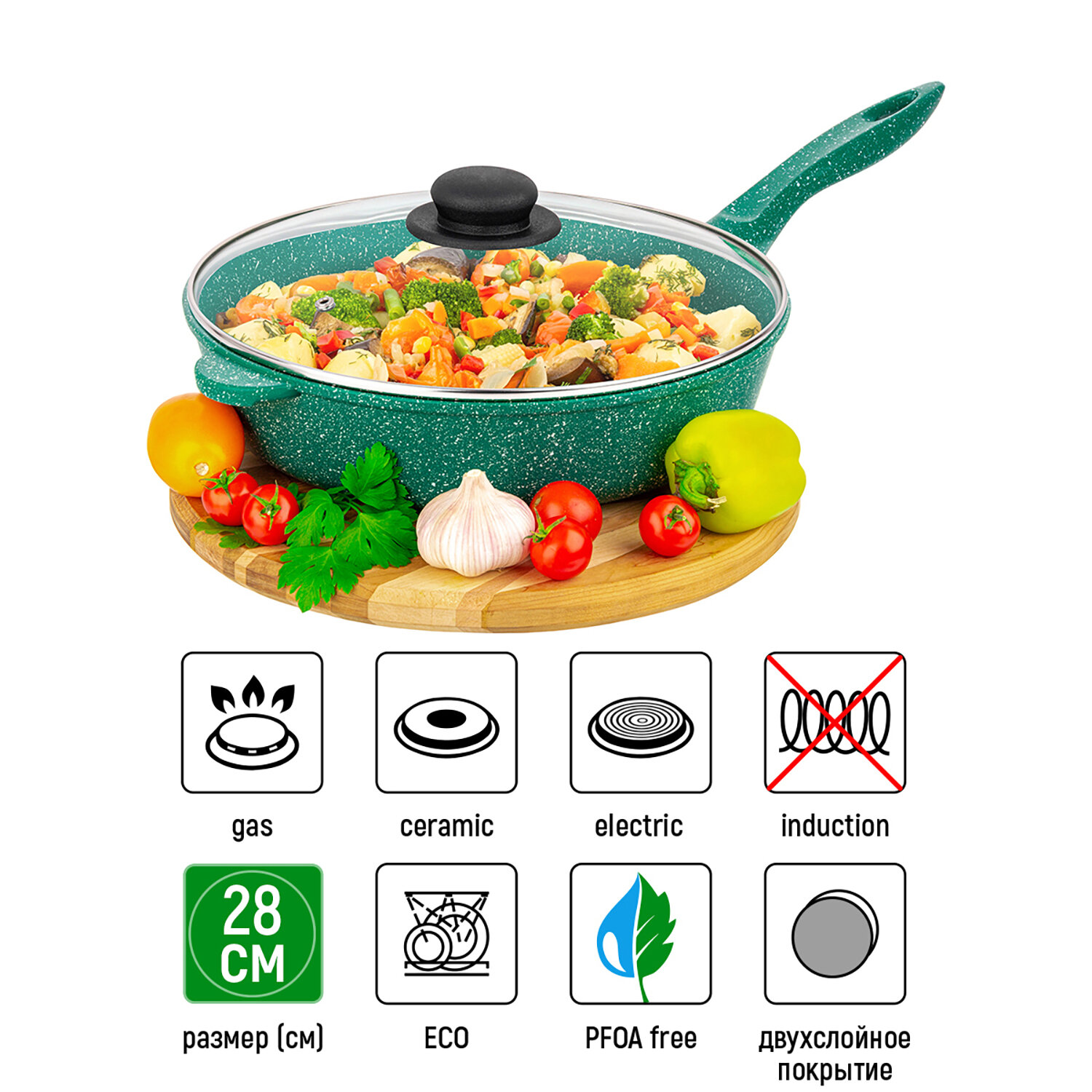 Сковородки Сковорода глубокая 28 см Elan Gallery гармония вкуса Изумруд с крышкой D28, с несъёмной ручкой