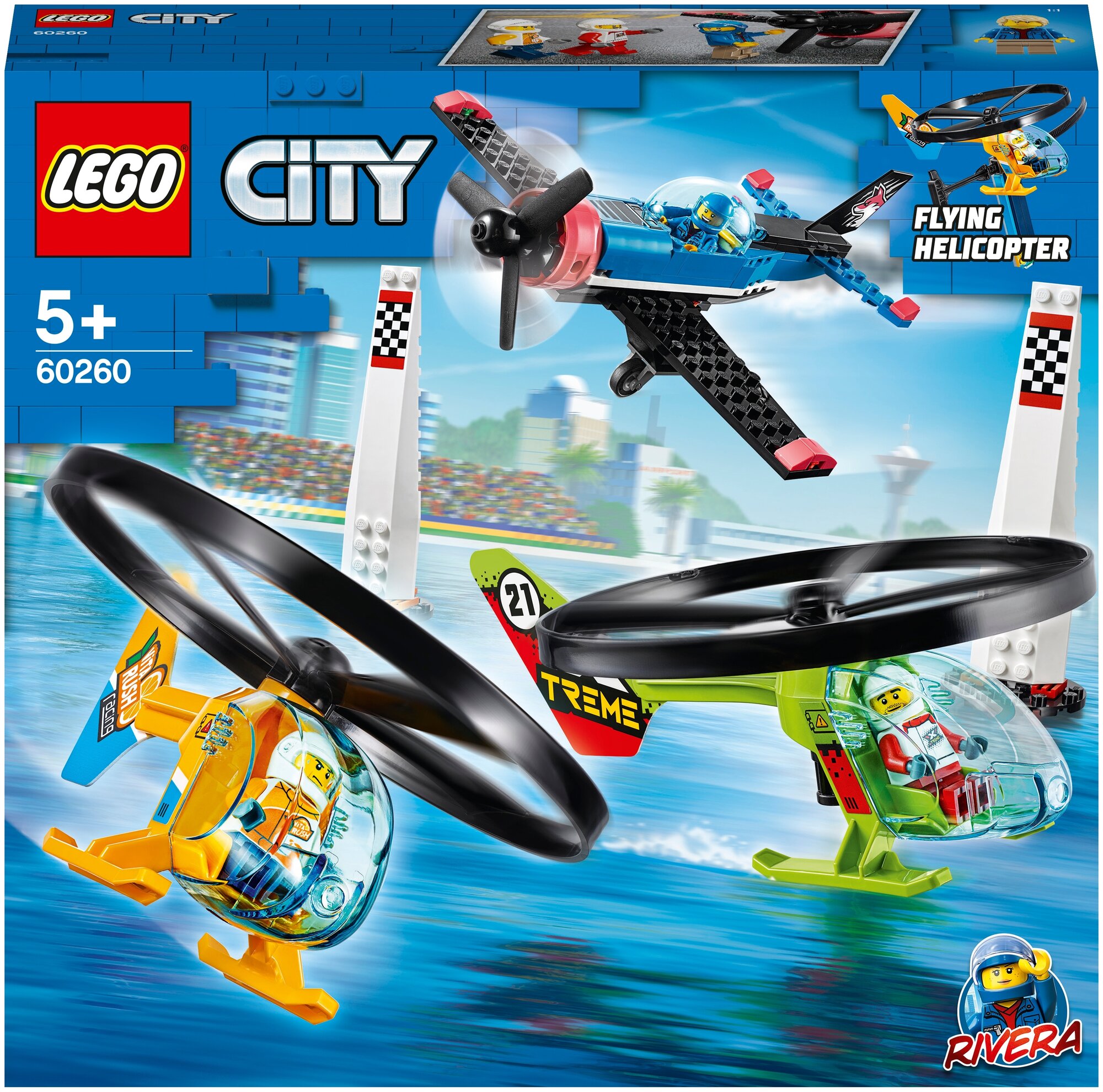 Лучшие цены. Пробудите детское воображение с помощью набора «Воздушная гонка» LEGO® City (60260), включающего в себя крутой винтовой пилотажный самолет, два вертолета с устройствами запуска и две ориентирные вышки. Мальчики и девочки отлично проведут время, запуская вертолеты в воздух и придумывая новые приключения с помощью трех минифигурок, в том числе с фигуркой Риверы, пилота-аса из мультсериала «Лего Сити: приключения», а также с фигурками пилотов вертолетов Экстрима и Витараша. Магазины в вашем городе.