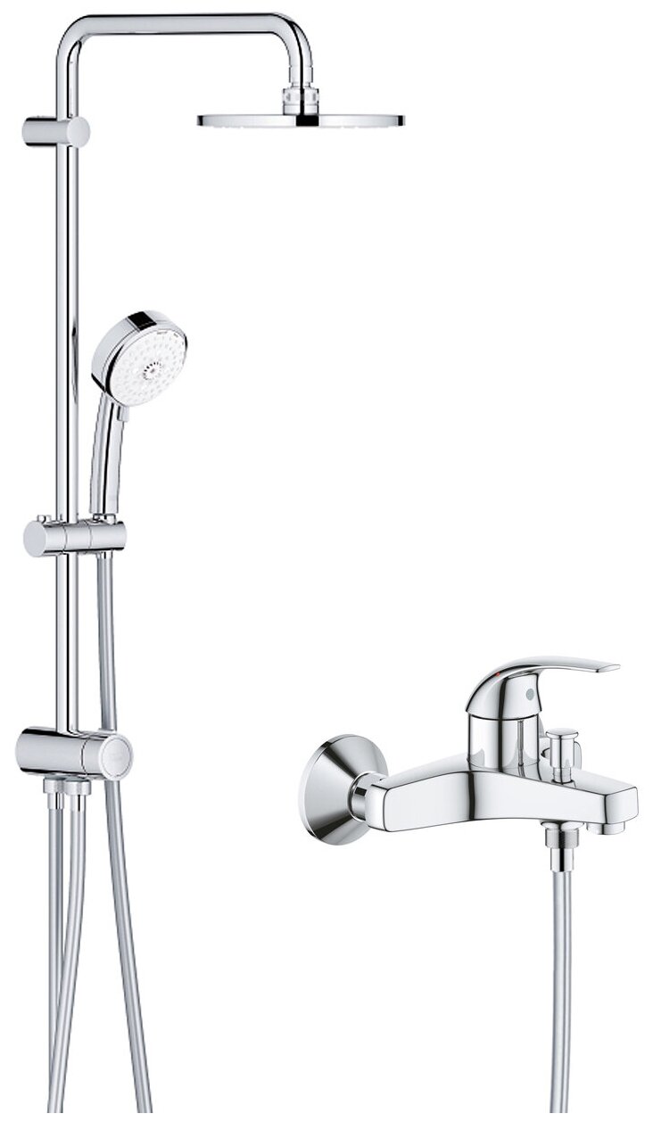 Лучшие цены. Смеситель для ванны Grohe Euroeco, хром; Душевая система Grohe Tempesta Cosmopolitan System 200 с верхним и ручным душем для настенного монтажа. 1. Смеситель для ванны Grohe Euroeco: Гарантия: 5 лет Страна: Германия Цвет: хром Переключатель воды ванна/душ: рычаг полуавтоматический Форма: округлая Дизайн-стиль: современный Вынос излива: 160 мм Межцентровое расстояние подключения:150+15 мм Управление: однорычажный Подключение шланга: для душевого шланга 1/2 дюйма Подводка воды: S-крепление с накидной. Магазины в вашем городе.
