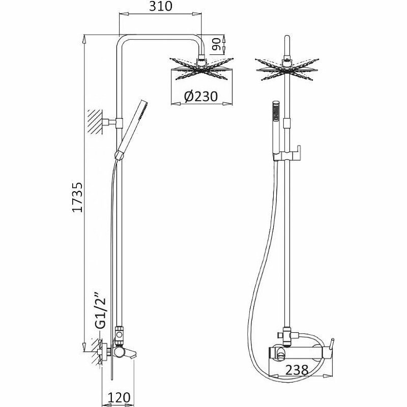 | Комплектация | ручной душ (душевая лейка) / верхний душ (тропический) / смеситель / стойка / штанга / душевой шланг / крепление ручного душа |
