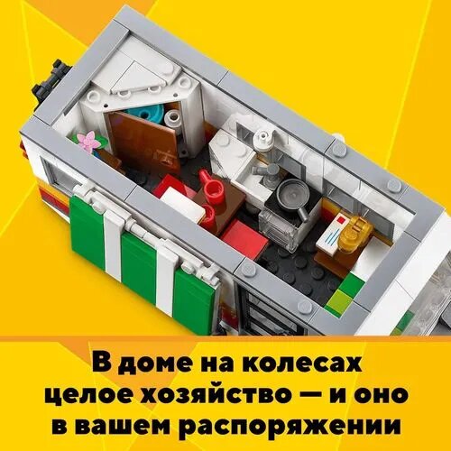 Лучшие цены. Поехать в отпуск, не покидая пределы комнаты, - это возможно с конструктором LEGO Creator «Отпуск в доме на колесах». Отправляйтесь на пикник и рыбалку вместе с папой, мамой и мальчиком. Для путешествия у них есть дом на колесах, который крепится к ретромобилю. Найдите подходящую площадку, где можно разбить лагерь и порыбачить. К вам в гости может заглянуть скунс. В любой момент дом на колесах можно перестроить в фургон или плавающий маяк. Магазины в вашем городе.