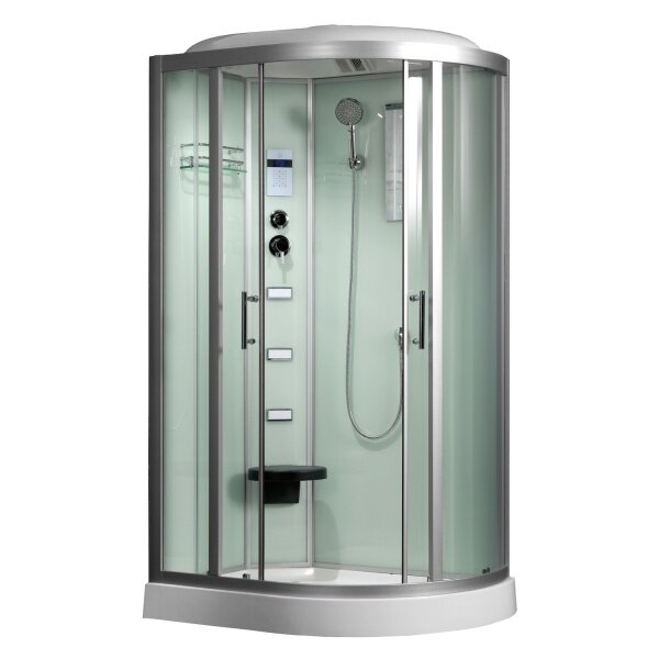 Лучшие цены. размер: 120x80 cм, угловая-асимметричная, поддон: низкий, прозрачные, с крышей, верт. массаж 3 форсунки , белый, электронный пульт, задние стенки: стекло , белый поддон, матовый хром профиля, стойка: белый, высота: 218 см, раздвижные, 6 мм, алюминий, 15 см, 15 см, закрытая, стекло, акрил, на поддон, верхний душ, освещение, радиоприемник, вентиляция, гидромассаж в кабине, турецкая баня, зеркало, полочка, сиденье, подключение к аудио, таймер. Магазины в вашем городе.