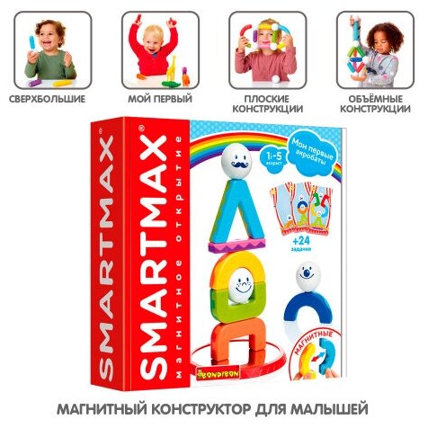 Лучшие цены. Магнитный конструктор «Мои первые акробаты» - очень милый и обязательно понравится малышам. Ведь теперь они могут бесконечно экспериментировать и строить различные конструкции. А еще их ждет магнитное открытие от Smartmax! Ведь разноцветные детали конструктора - самые настоящие магниты с разными полюсами. Причем тёплые цвета имеют одну полярность, а холодные другую. Одни элементы можно соединить, а другие отталкиваются друг от друга. Такие особенности позволяют изучать цвета и запоминать их еще лучше. Магазины в вашем городе.