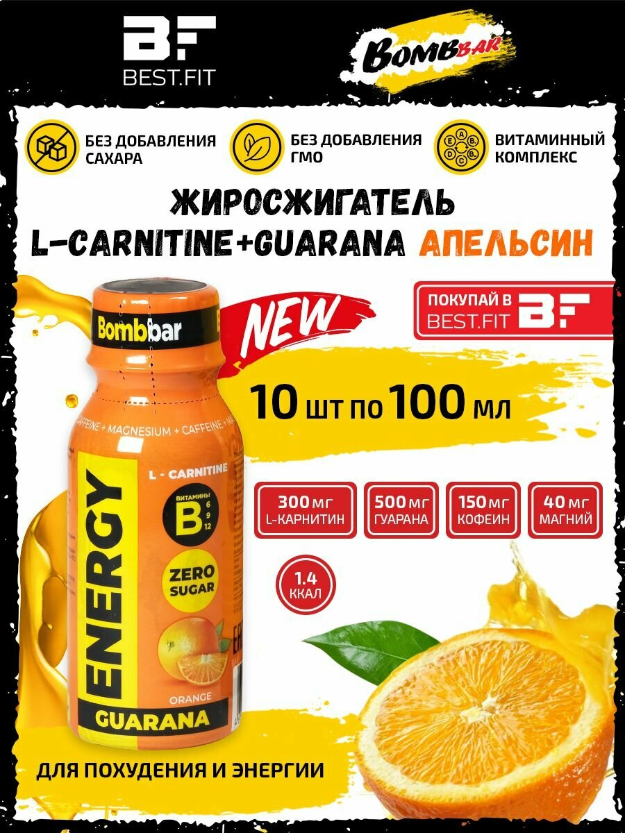Сжигатели жира Л-карнитин Жиросжигатель Bombbar ENERGY L-carnitine + Guarana (Апельсин) 10x100мл / Для похудения женщин и мужчин / Термогеник