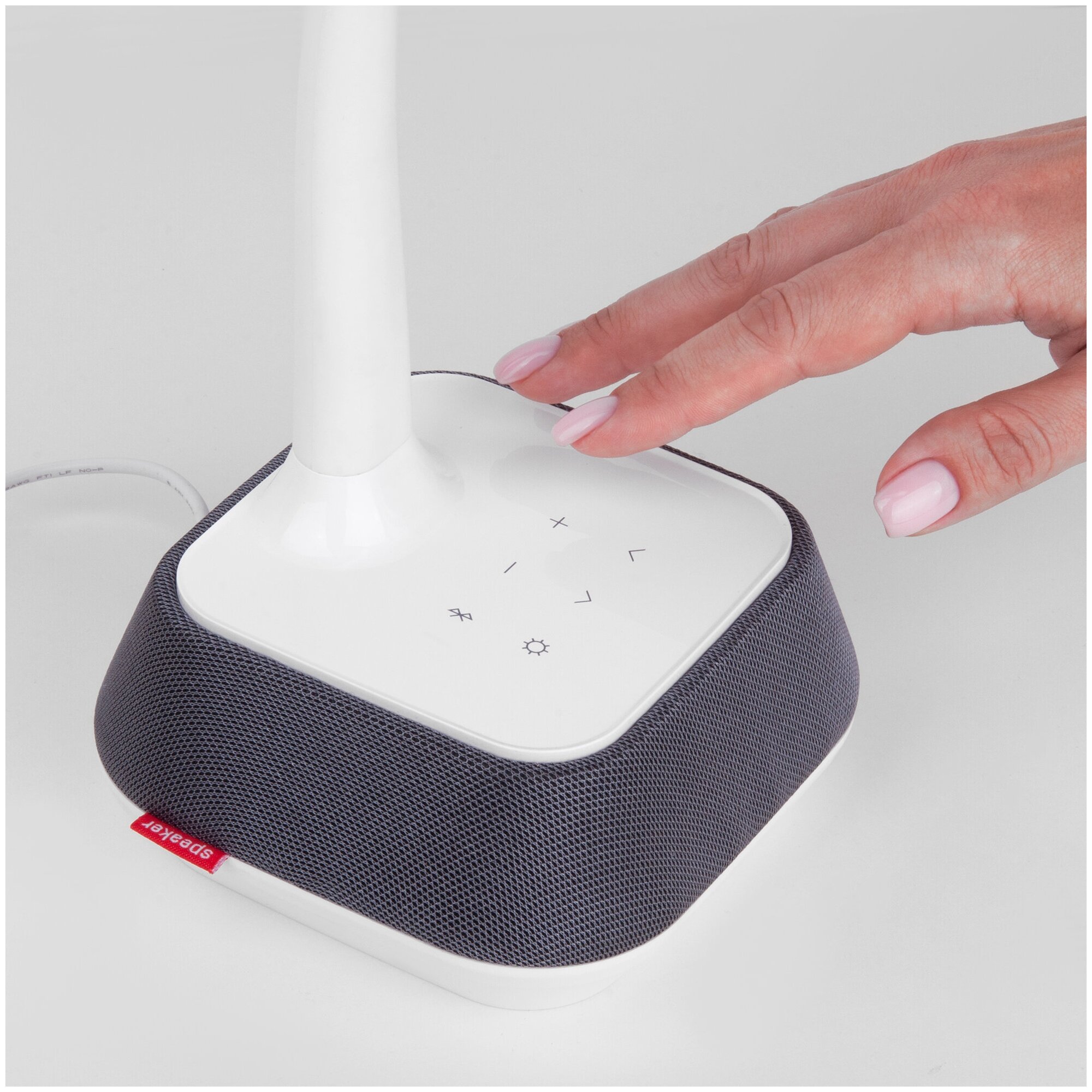 Лучшие цены. Настольный светодиодный светильник 80417/1 белый является важным элементом в создании освещения рабочего пространства и широко используется в жилых и офисных помещениях. Светильник оснащен экономичными SMD светодиодами мощностью 12 Вт, создающие равномерный световой поток 250 лм и имеющие комфортную цветовую температуру 6500 К. Кроме качественного освещения светильник имеет сенсорное управление, а так же Bluetooth для проигрывания музыки, динамик для проигрывания музыки, разъем AUX. Магазины в вашем городе.
