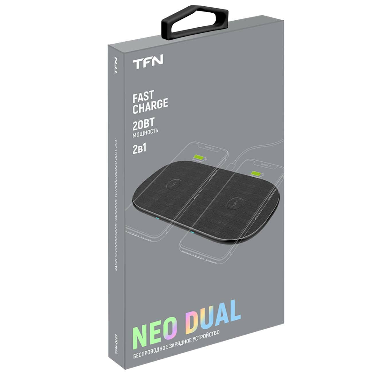 Лучшие цены. На беспроводной зарядной базе TFN Neo Dual можно одновременно размещать сразу два мобильных устройства. Благодаря мощности 20W она обеспечит быструю подпитку мобильной техники, поддерживающей стандарт Qi. основные характеристики За счёт компактных размеров аксессуар не занимает много места на столе, а прорезиненное основание препятствует скольжению по поверхности. Функция защиты от перегрева предотвращает повреждение аккумулятора из-за высоких температур и продлевает срок его службы. Магазины в вашем городе.