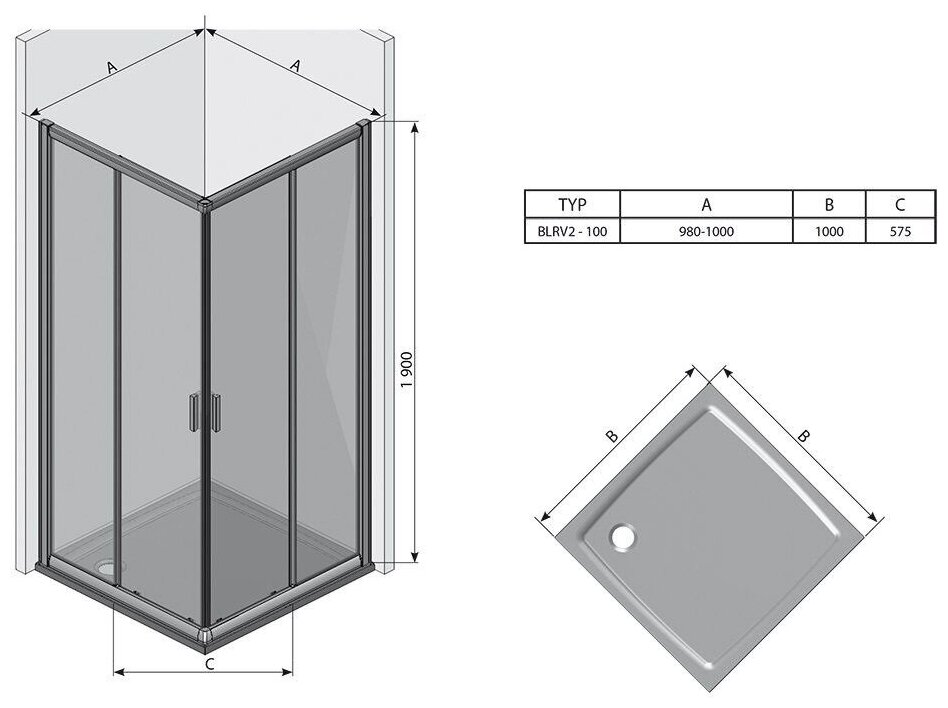 Душевой уголок прямоугольный раздвижной Ravak Blix BLRV2К-100 блестящий+транспарент