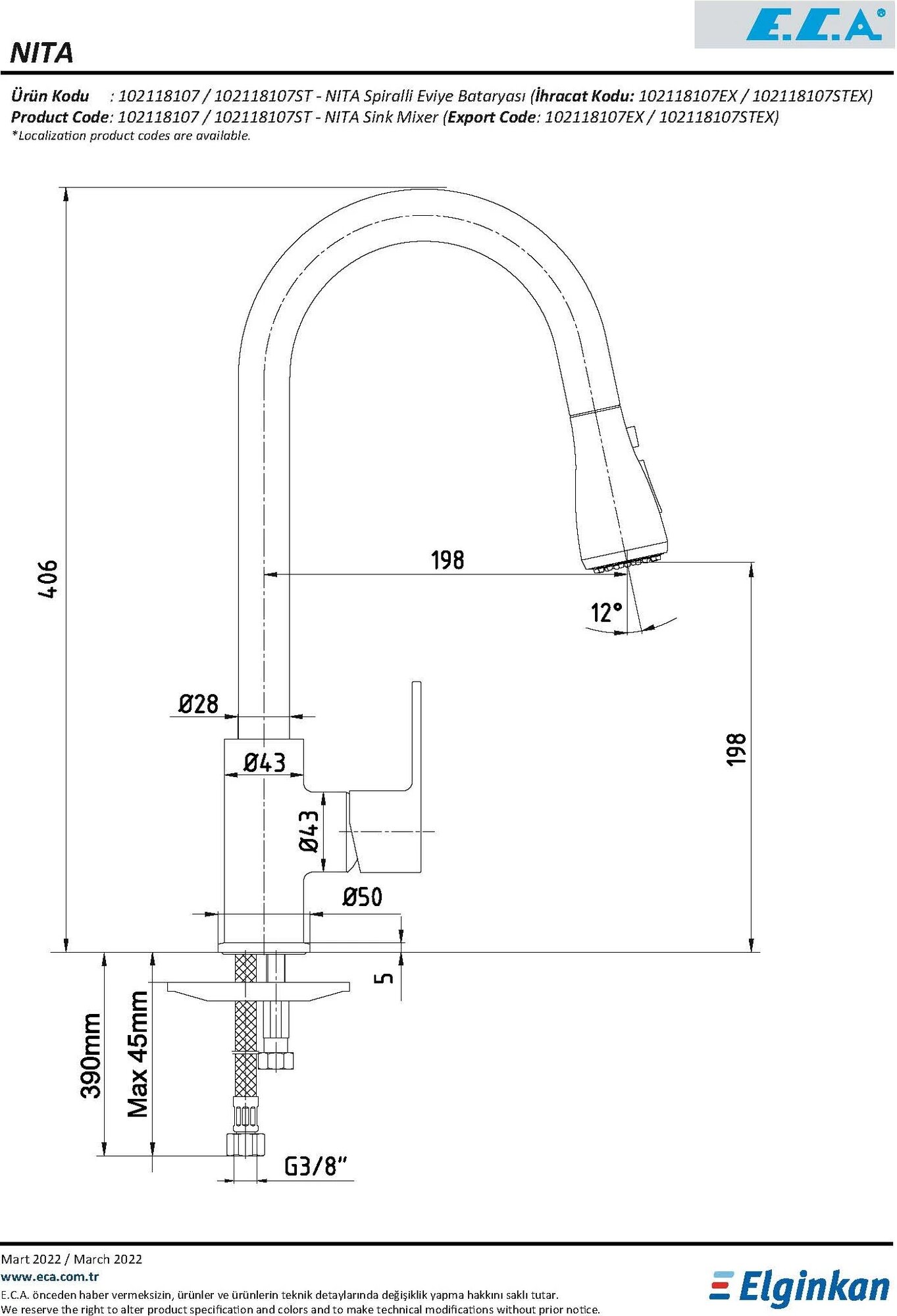 Смеситель для кухни c выдвижным изливом E.C.A Nita 102118107EX