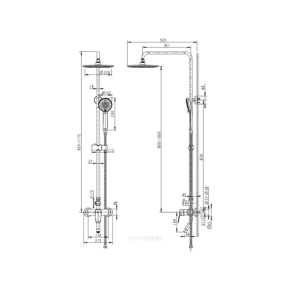 | Комплектация | ручной душ (душевая лейка) / верхний душ (тропический) / смеситель / стойка / штанга / душевой шланг / крепление ручного душа |