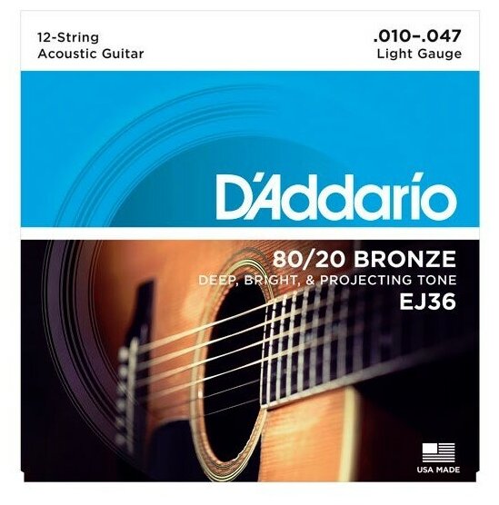 Струны D'ADDARIO EJ36 BRONZE 12-STRING ACOUSTIC GUITAR STRINGS, LIGHT, 10-47 струны для 12-струнной акустической гитары, сталь/бронза