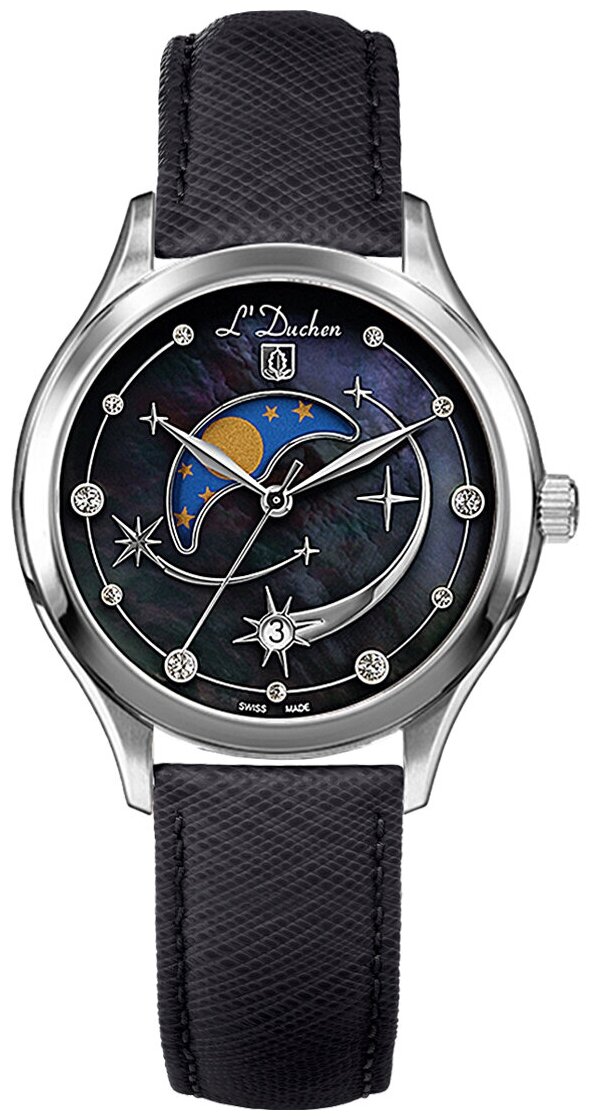 Лучшие цены. Часы наручные L'Duchen D 837.11.41. По задумке дизайнеров на черном циферблате часов мы можем наблюдать завораживающее космическое явление: метеорный поток Персеиды. Падающие «звезды» присутствуют в виде фианитов разного размера и накладных элементов из стали. В верхней части циферблата из натурального перламутра расположен индикатор фаз луны, который элегантно декорирован металлической рамкой. На шести часах размещен указатель даты, оформленный в виде звезды. Магазины в вашем городе.