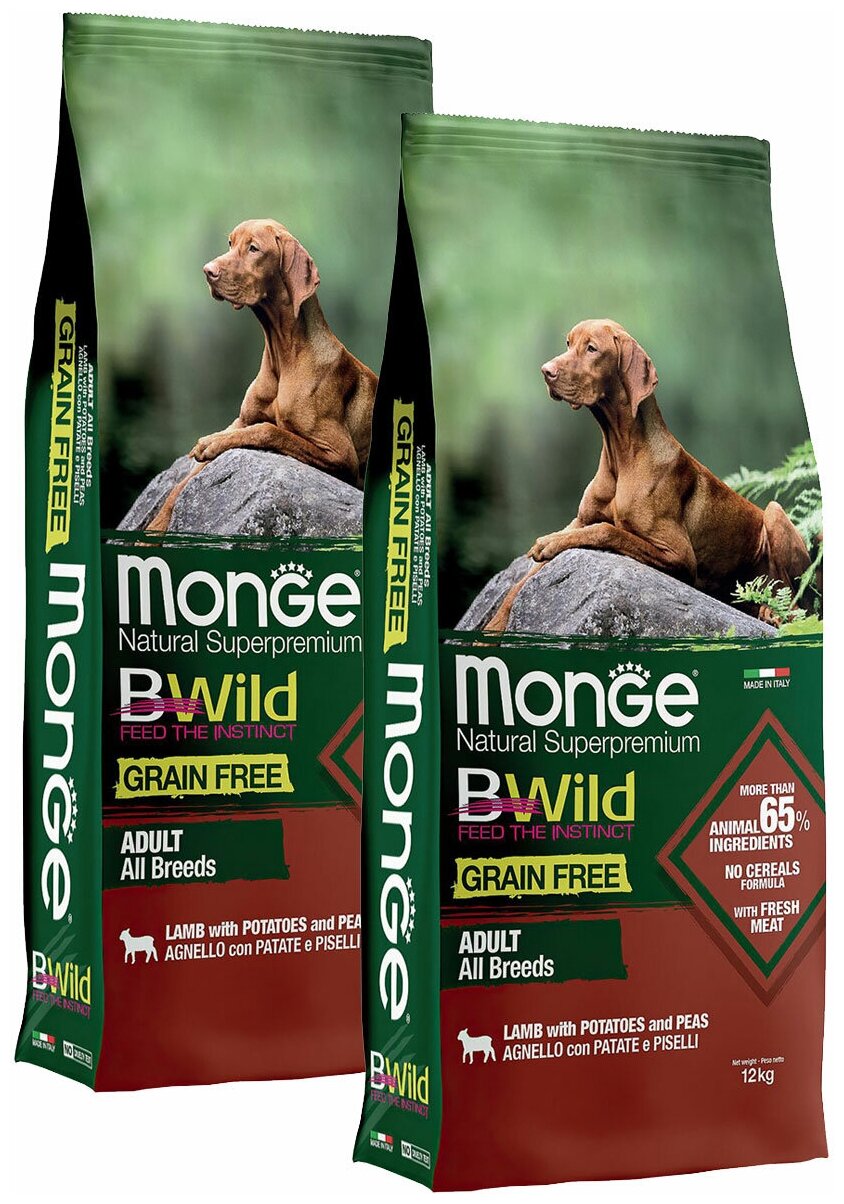 Корм для собак MONGE BWILD GRAIN FREE DOG ADULT ALL BREEDS LAMB беззерновой для взрослых собак всех пород с ягненком, горохом и картофелем (12 + 12 кг)