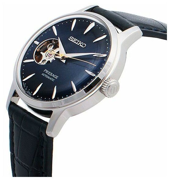 Лучшие цены. Классические часы без лишних деталей - идеальный вариант для успешной женщины. Presage. Сквозь прозрачное окошко на циферблате можно наблюдать за работой механизма часов. В механизме 24 камня, частота 21600 полуколебаний в час. Запас хода до 41ч. Функция stop-second. stop-second Функция, позволяющая остановить часовой механизм для установки времени с точностью до секунды. Возможность ручного завода. Рифленая заводная головка. Магазины в вашем городе.