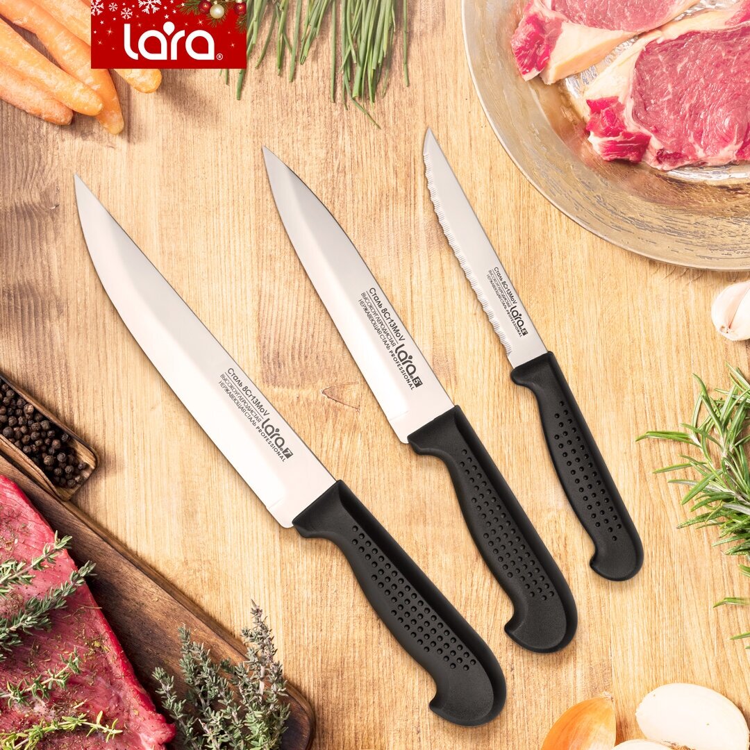 Набор ножей LARA LR05-46, 3 предмета, поварской, универсальный/для овощей, пластиковая черная ручка, блистер