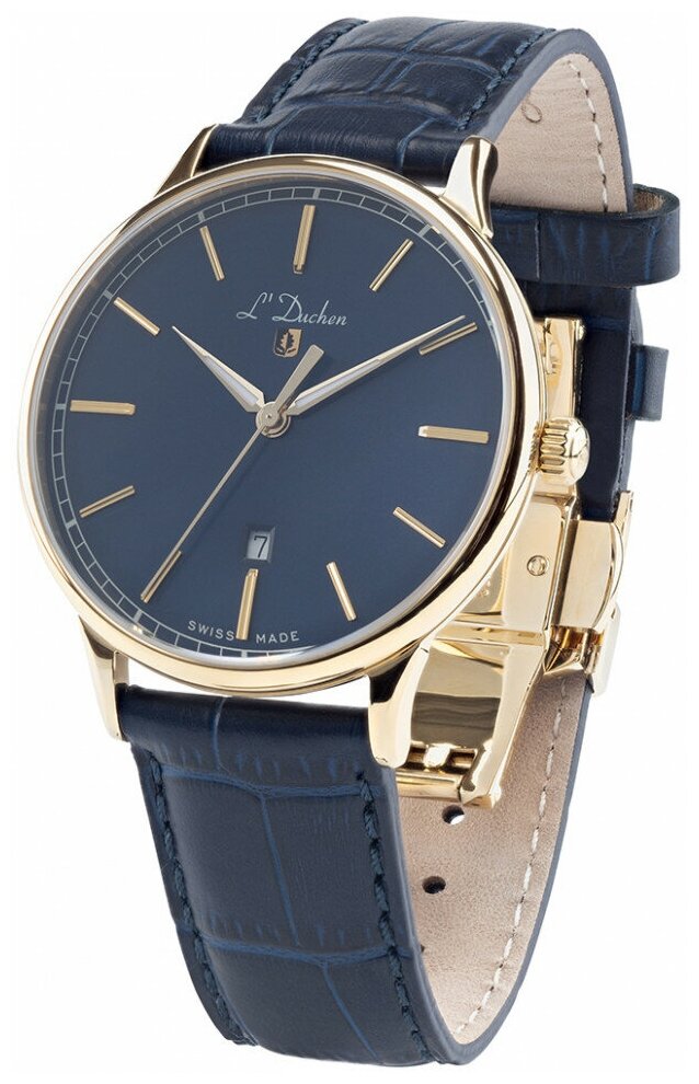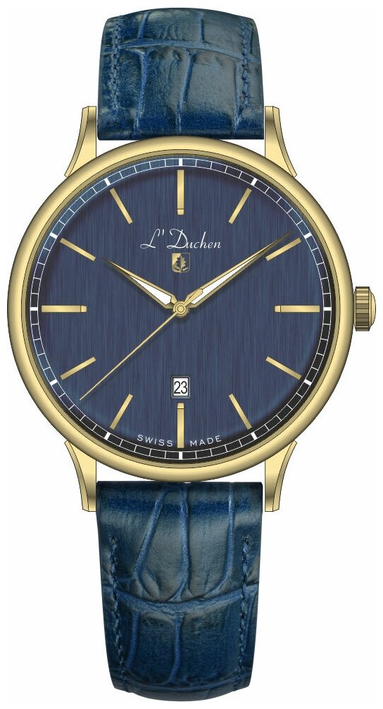 Лучшие цены. Часы наручные L'Duchen D 821.23.37. Классические мужские часы в стиле винтаж приглашают нас соприкоснуться с атмосферой прошлых лет. Надежный швейцарский кварцевый механизм обеспечивает точную работу часов. Корпус модели из высоколегированной нержавеющей стали 316L с PVD-покрытием желтого золота выглядит строго и респектабельно. Ушки и безель разработаны тонкими и элегантными. Немного выгнутый синий циферблат и полировка в виде вертикального матирования подчеркивают ретро стиль модели. Магазины в вашем городе.