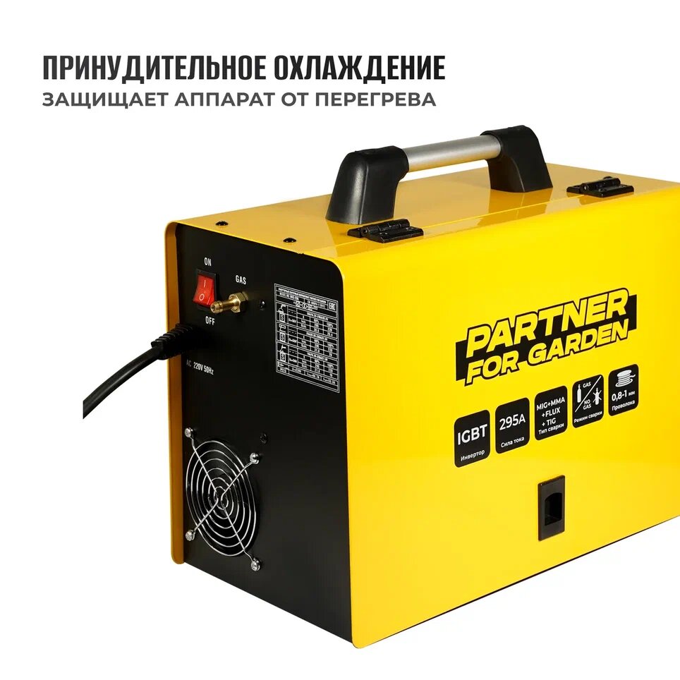 Лучшие цены. Сварочный инвертор PARTNER FOR GARDEN MIG-295 4 в 1 предназначен для полуавтоматической сварки в среде защитного газа MIG-MAG, а так же для работы с порошковой самозащитной проволокой в режиме NO GAS. Наконечник 0,8 мм находится в газовой горелке Благодаря продолжительному режиму работы на максимальных токах аппарат прекрасно подходит для работы как на бытовом так и на профессиональном уровне. Магазины в вашем городе.
