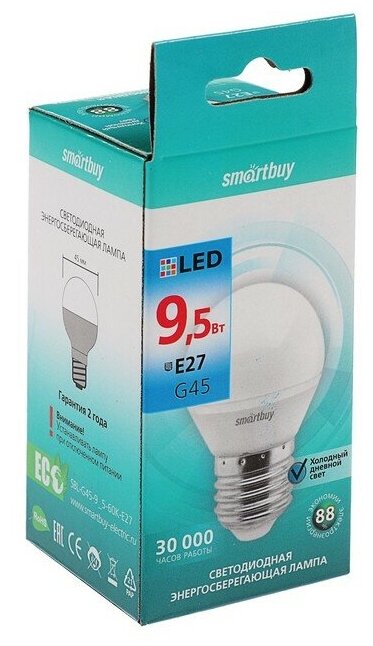 Лучшие цены. Характеристики Мощность (Вт): 9,5 Напряжение, В: 220 Цоколь: E27 Цветовая температура, К: 6000 Цветопередача, Ra: 80 Диаметр, мм: 45 Длина, мм: 80 Вид: FR/матированная Тип колбы: G Форма: шар Световой поток, Лм: 760 Срок службы, ч: 17520 Цветность: холодный белый (более 5000 К). Магазины в вашем городе.