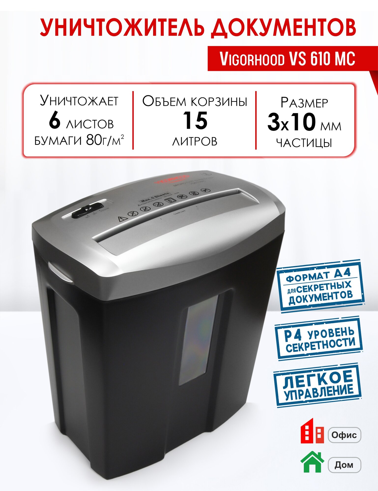 Уничтожители бумаги (шредеры) Уничтожитель документов Vigorhood VS610MC, 3x10 мм, 6 листов, 15 л, P4