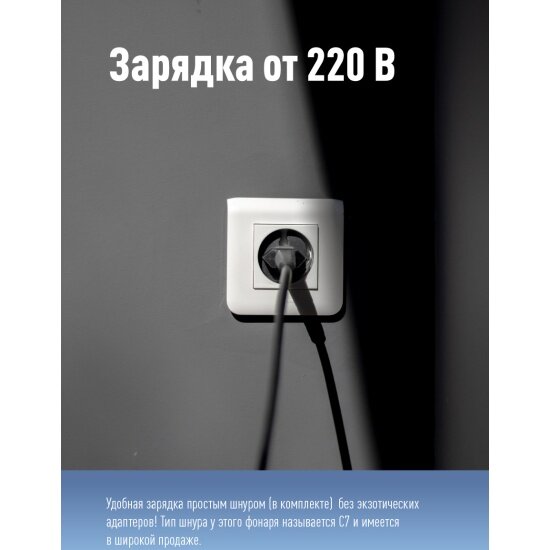| Комплектация | ЗУ фонарика / элемент(ы) питания / встроенный аккумулятор / |
