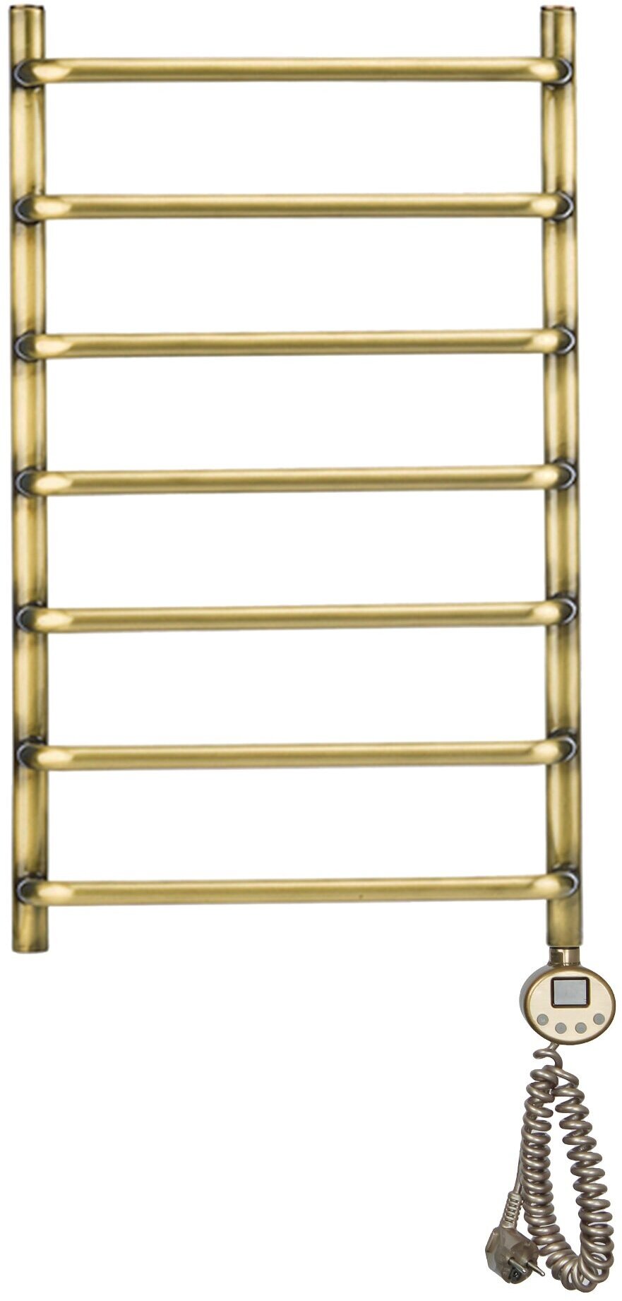 Лучшие цены. Характеристики: Высота: 70 см Межосевое расстояние: 40 см Ширина: 42.8 см Количество перекладин: 7 Коллекция: Стефано Тип: электрический Форма: лесенка Направление подключения: нижнее; справа С боковым подключением: нет Глубина: 12.5 см Мощность: 300 Вт Поворотный: нет Полка в комплекте: нет Материал: латунь Подключение: электропровод с вилкой Монтаж: подвесной Цвет: бронза Гарантия на полотенцесушитель: 24 мес Страна происхождения бренда: Россия Теплоноситель: антифриз Площадь обогреваемого помещения: 3 м2. Магазины в вашем городе.