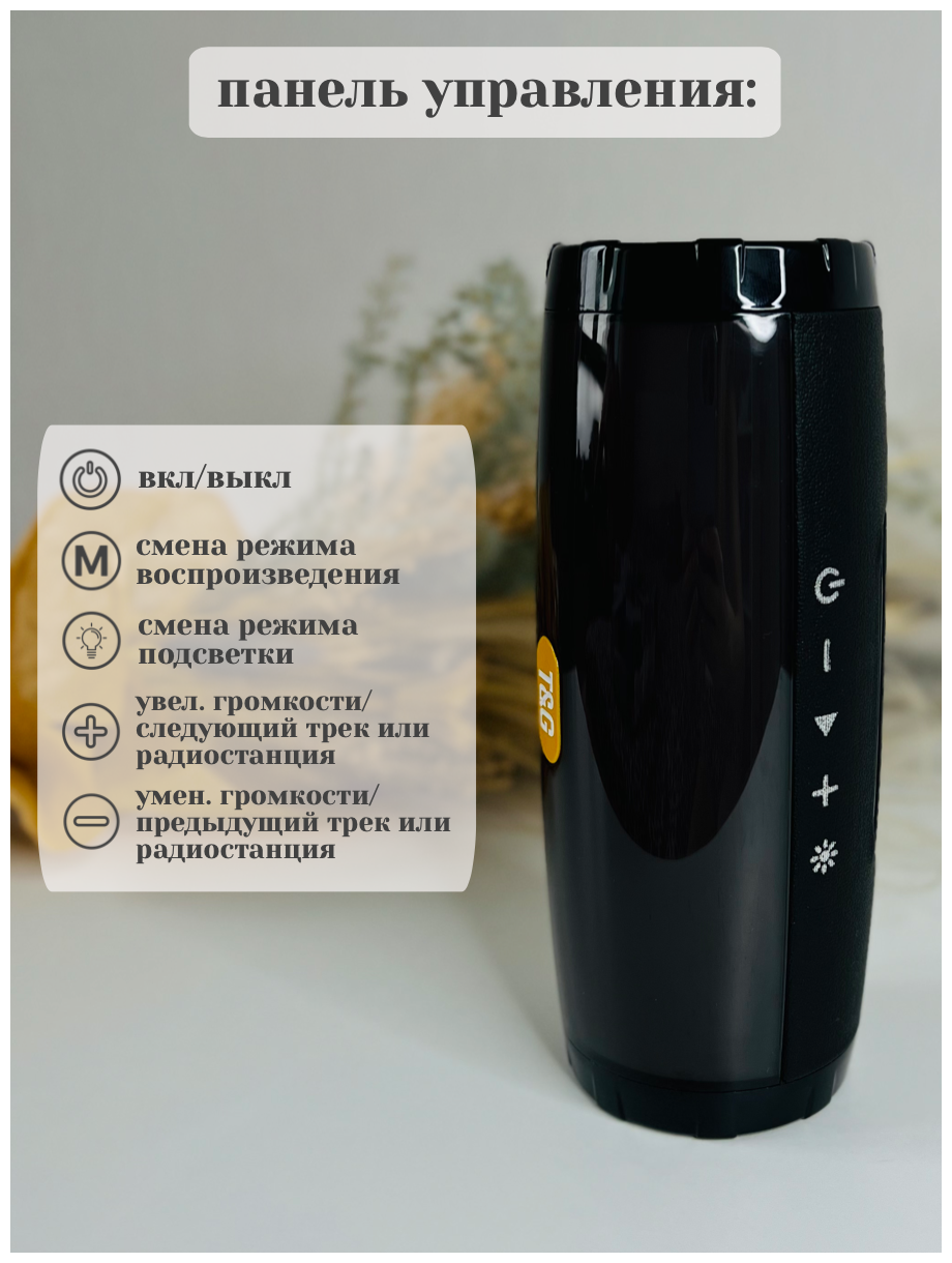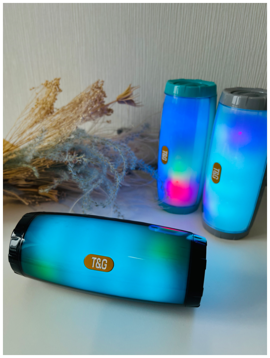 Лучшие цены. Беспроводная музыкальная колонка TG, компактная и удобная, не занимает много места в сумке. Несколько вариантов подсветки позволят выбрать то, что вам по вкусу. Для полного отключения подсветки нужно на несколько секунд задержать кнопку переключения световых режимов. Воспроизводит музыку через bluetooth, карты памяти micro SD, USB Flash и линейный AUX вход. Магазины в вашем городе.