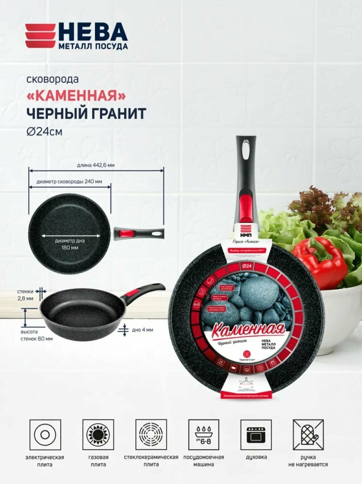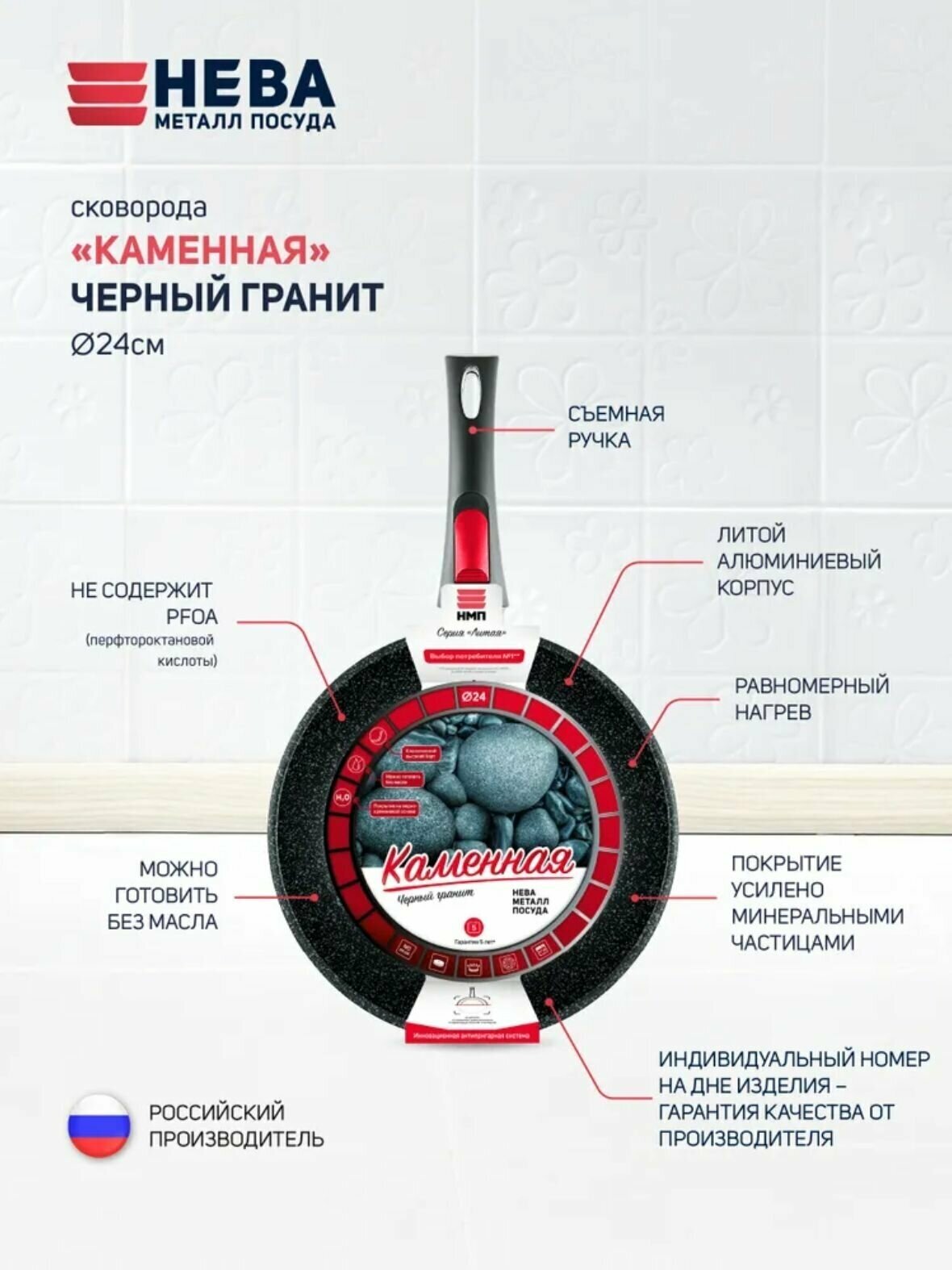Сковорода Нева Металл Посуда НМП "Каменная" Чёрный гранит со съемной ручкой 24 см (18024)