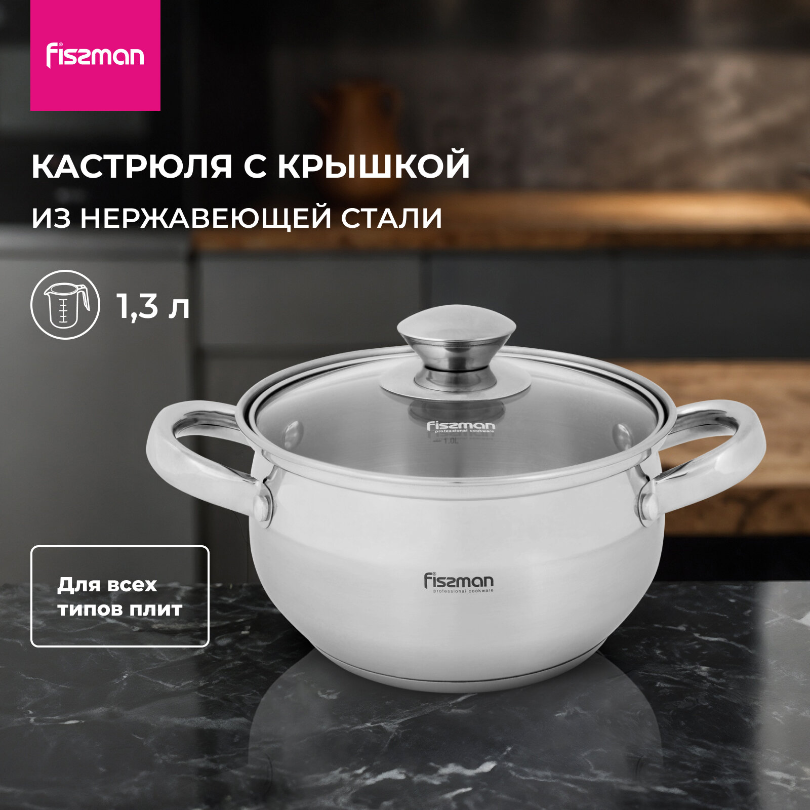 Кастрюля 5510 FISSMAN Кастрюля PRIME 1,3 л; 14x8,5 см с крышкой (нерж.сталь) Ручки - нерж.сталь; Крышка - стекло; Индукция; Термоаккумулирующее многослойное дно.
