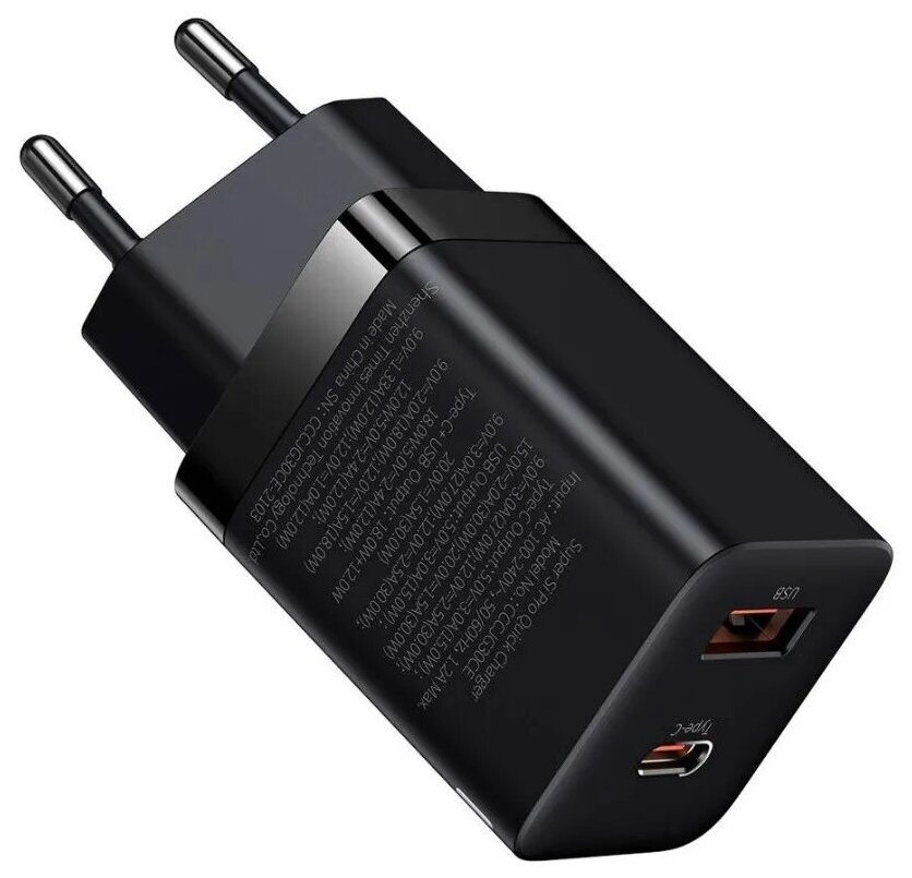 Зарядки для гаджетов Зарядка для телефона 1 USB+Type-C 3A Baseus Quick Charge 30W Black, сетевое зарядное устройство ЮСБ+Тайп Си, адаптер для быстрой зарядки 30 Вт