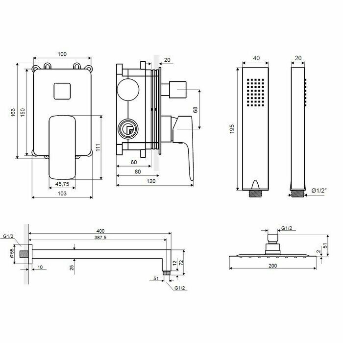 | Комплектация | ручной душ (душевая лейка) / верхний душ (тропический) / смеситель / излив / душевой шланг / крепление ручного душа / настенный кронштейн |