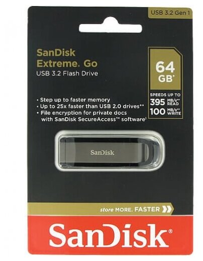 Лучшие цены. Благодаря скорости записи до 150 МБ/с флеш-накопитель SanDisk Extreme Go USB 3.1 ускоряет копирование. Он до 35 раз быстрее стандартных флеш-накопителей с интерфейсом USB 2.07, а это значит, что вы сможете записать на него полнометражный фильм в формате 4К менее чем за 40 секунд. Когда накопитель не используется, выдвижной разъем надежно защищен. Магазины в вашем городе.