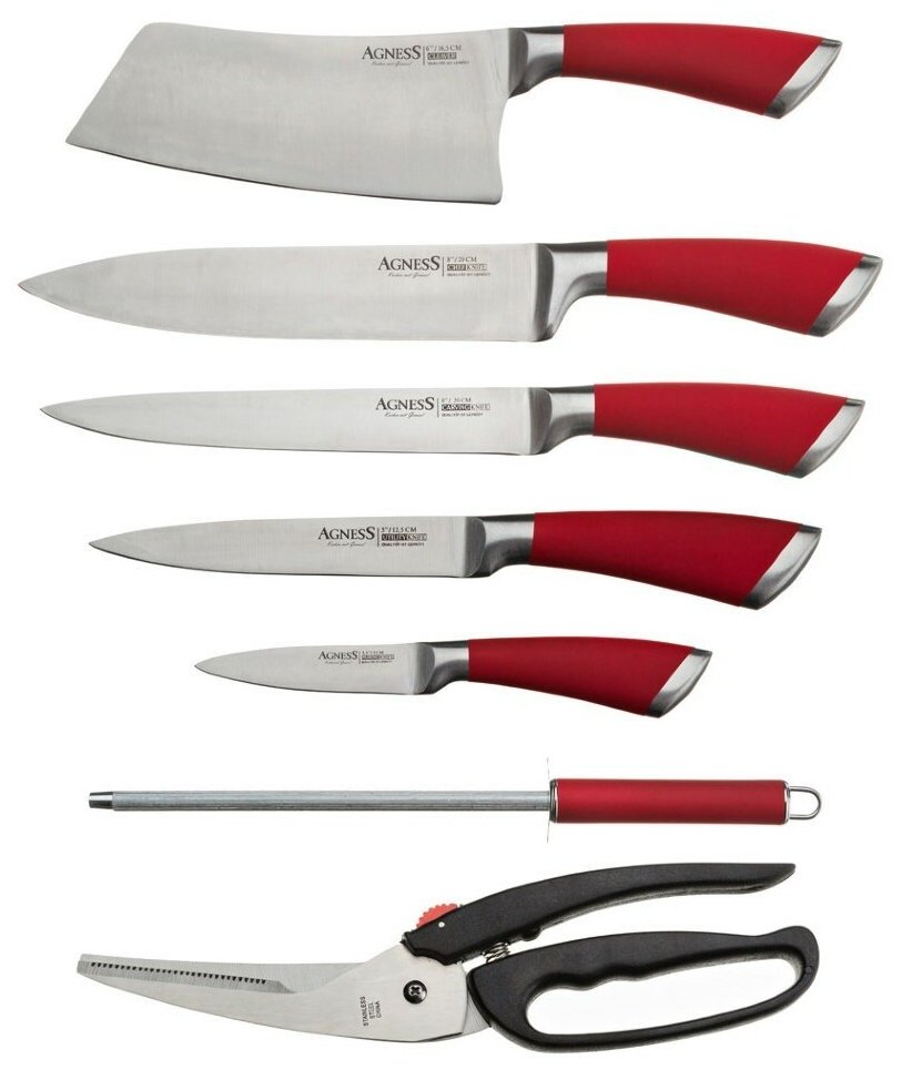 Лучшие цены. Набор ножей Agness с силиконовыми ручками на пластиковой подставке 8 пр. Нож - главный инструмент на кухне, а вернее ножи, так как даже самый лучший нож не сможет справиться со всем многообразием задач. Выбирая набор ножей AGNESS, Вы приобретаете комплект самых необходимых и чаще всего используемых ножей. Преимущества ножей AGNESS: ● Эргономичная ручка с покрытием Soft Touch для удобной нарезки ● Лезвие из высокоуглеродистой коррозионной стали ● 2-х сторонняя заточка лезвия ● Удобная вращающаяся подставка. Магазины в вашем городе.
