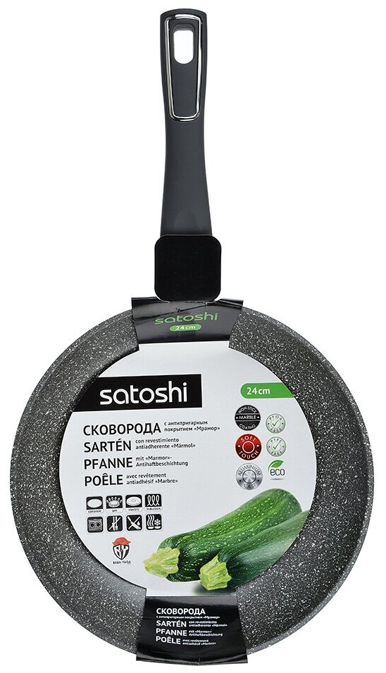 Лучшие цены. Сковорода SATOSHI Стенвиль диаметром 24 см изготовлена из высококачественного литого алюминия с антипригарным покрытием под мрамор. Все это способствует быстрому и равномерному нагреву. Пища не прилипает к стенкам посуды, на ней можно готовить с минимальным добавлением масла и жиров. Чтобы вам легче было найти наш товар, мы добавили запросы для поисковой строки: сковорода, набор посуды, сковорода с антипригарным покрытием, кастрюли и сковороды, посуда для кухни, сковородка, сковорода блинная, блинная. Магазины в вашем городе.