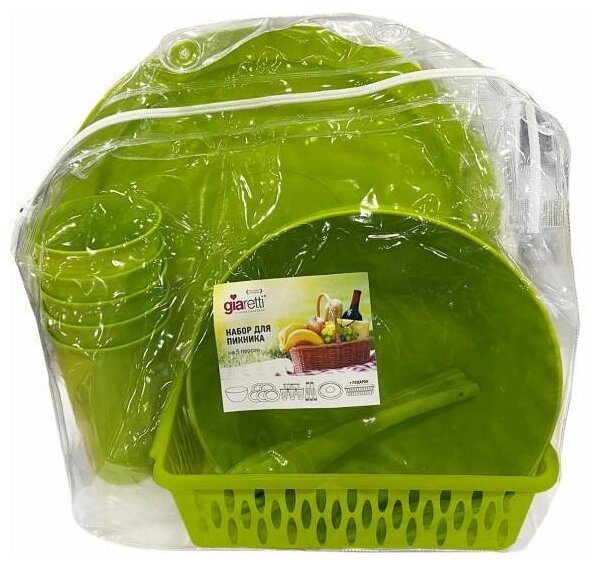 Лучшие цены. Собираетесь весело отдохнуть на природе с семьей или друзьями? Тогда вам точно понадобиться набор многоразовой пластиковой посуды для пикника и барбекю. Миска для салата, стаканы, тарелки, ложки, вилки и другие полезные предметы легкие и удобные в переноске. Они без проблем моются даже в посудомоечной машине и подходят для многократного применения. Для вас мы предлагаем Набор для пикника Giaretti Bono на 5 персон 310х270х125 мм цвета оливковая роща бренда Giaretti (размеры 310х270х125 мм). Магазины в вашем городе.