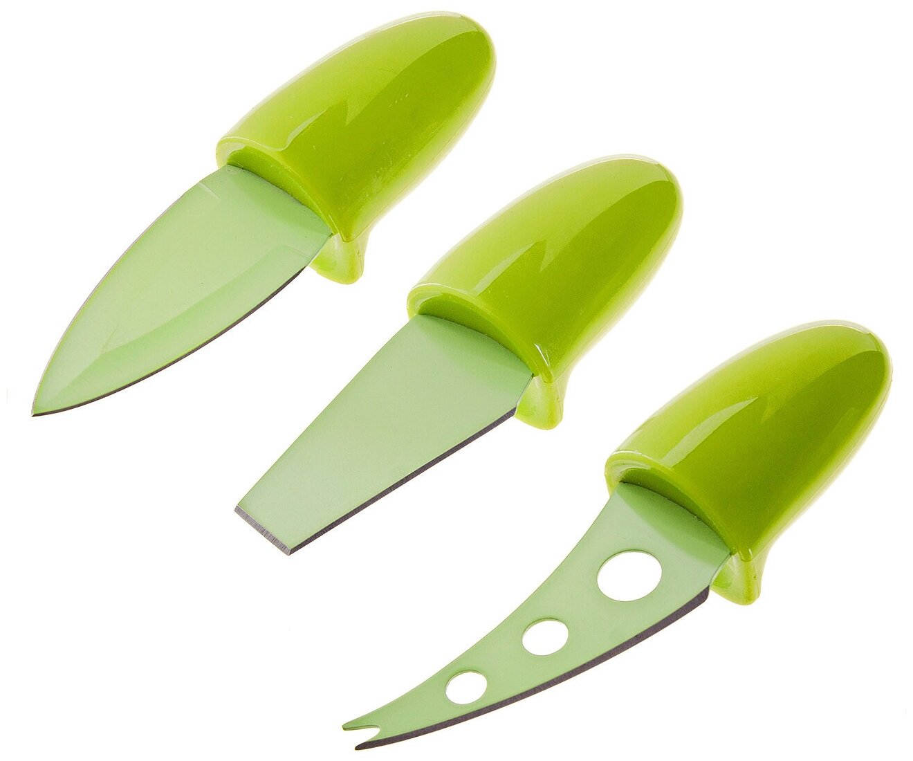 Лучшие цены. Ножи для сыра 3 пр МВ (х72). Материал лезвий: нержавеющая сталь. Материал ручек: полипропилен. Цвет: салатовый. Длина ножа 13 см: лезвие 7 см. Длина ножа 12 см: лезвие 6 см. Длина ножа: 11,5 см: лезвие 5 см. Размер упаковки: 13 х 12 х 11,5 см. Вес: 172 г. Страна производитель: Китай. Набор состоит из трех ножей для сыра, предназначенных для разных видов сыра. Лезвия выполнены из нержавеющей стали с цветным покрытием Non-Stick, которое предотвращает прилипание сыра к лезвию. Магазины в вашем городе.