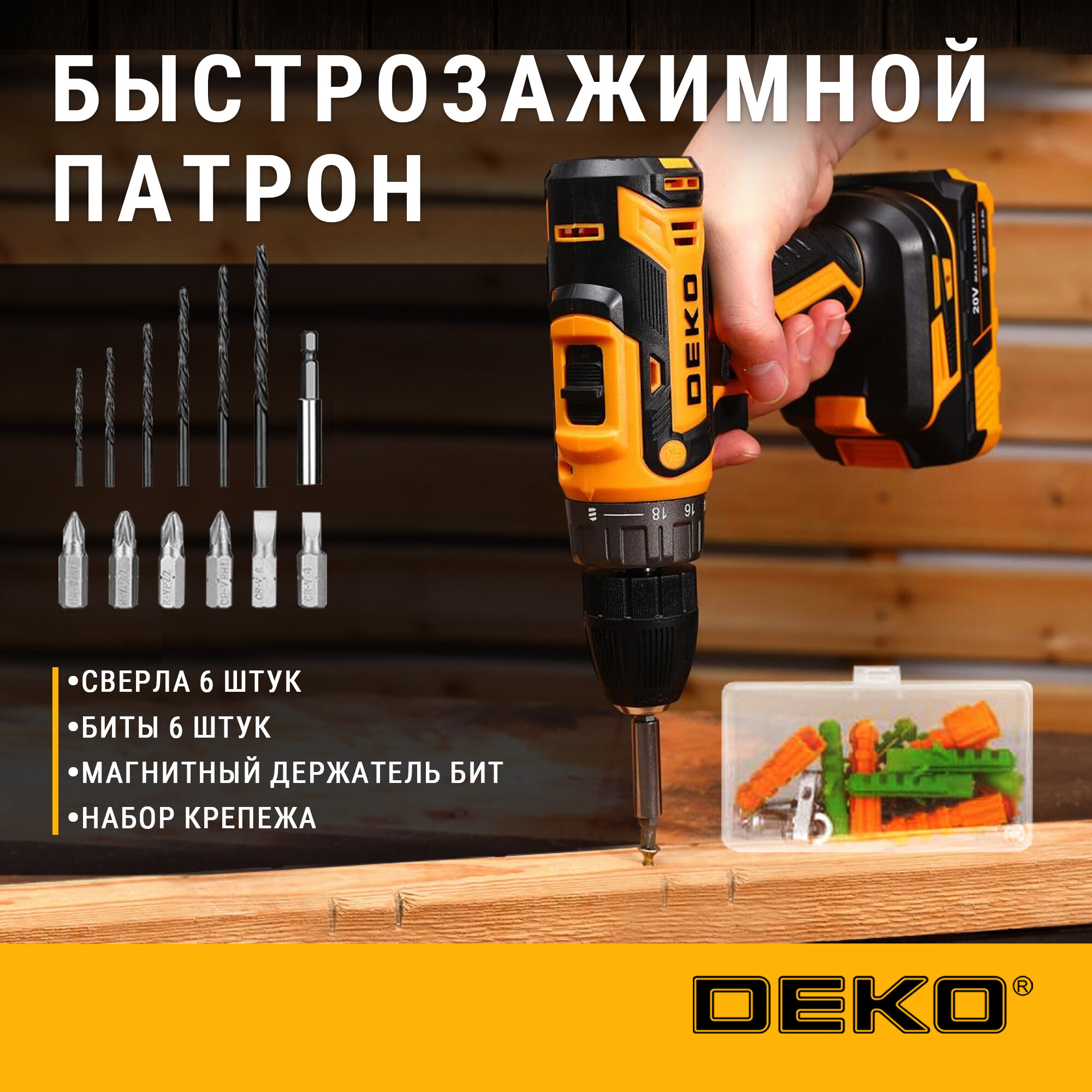 Дрель аккумуляторная DEKO DKCD20FU-Li + набор 63 инструмента в кейсе, 2x3.0Ач, з/у 063-4175