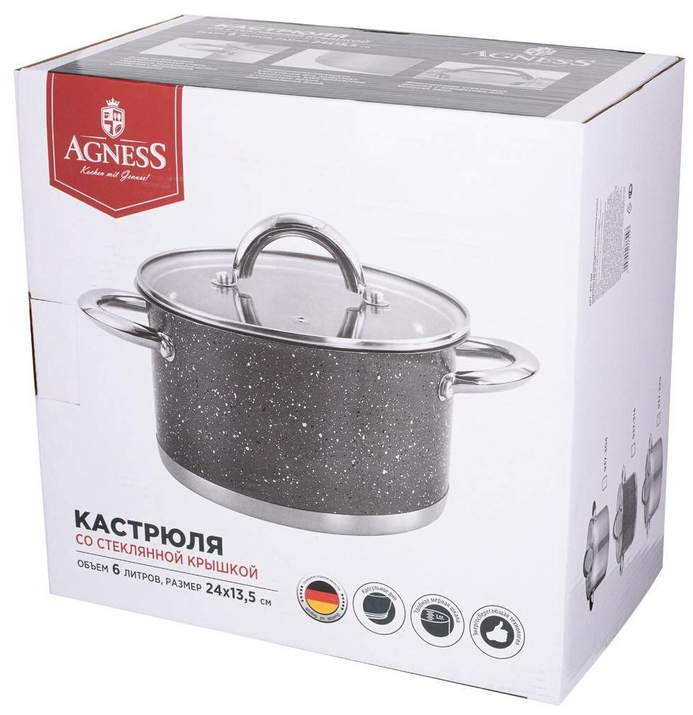 Лучшие цены. Кастрюля со стеклянной крышкой, нерж. сталь 6,0л 24х13,5см Agness (937-329) Бренд AGNESS представляет кастрюли из нержавеющей стали серии Midnight. Изюминка этой серии - это широкое дно и оптимальное сочетание толщины стенок и дна кастрюли. Благодаря энергосберегающему дну блюда, приготовленные в такой кастрюле, дольше останутся горячими. Энергосберегающее капсульное дно обеспечивает быстрый и равномерный нагрев посуды. Магазины в вашем городе.