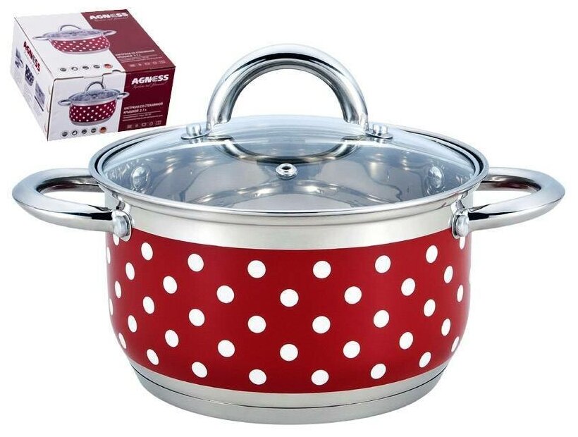 Кастрюля со стеклянной крышкой AGNESS "горошек" нерж. Сталь 2,7 Л диаметр=18 СМ высота=10 СМ (КОР=6Ш