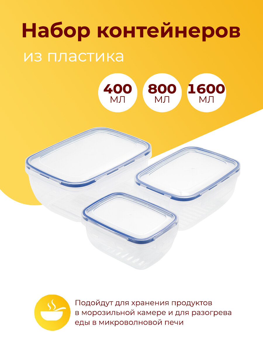 Пищевой контейнер Набор контейнеров пищевых пластиковых для хранения продуктов с крышками, 400/800/1400 мл, 3 шт