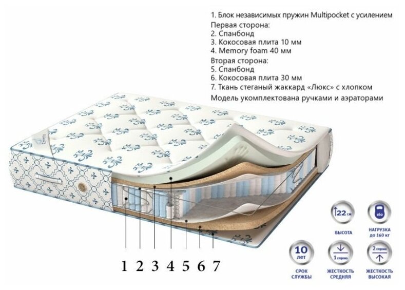 Лучшие цены. Двусторонний матрас Relax Memory на независимом пружинном блоке с кокосовой койрой, мемори и ватином. Блок независимых пружин - это надежная, проверенная временем конструкция, долговечность, удобство и комфорт, отличные высокого комфорта и Комфортные свойства. Каждая пружинка в таком блоке не имеет воздействия на соседние. Кокосовая койра - это натуральный, гипоаллергенный, жесткий наполнитель. Он придает матрасу уровень жесткости выше среднего с одной стороны и немного смягчается ватином. Магазины в вашем городе.