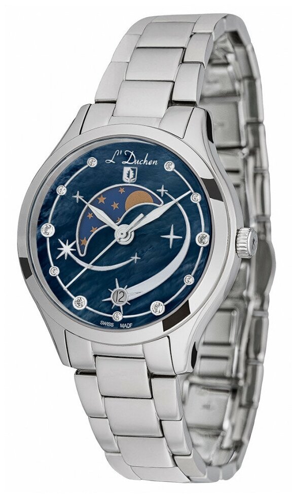 Лучшие цены. Часы наручные L'Duchen D 837.10.47. По задумке дизайнеров на циферблате часов синего цвета мы можем наблюдать завораживающее космическое явление: метеорный поток Персеиды. Падающие «звезды» присутствуют в виде фианитов разного размера и накладных элементов из стали. В верхней части циферблата из натурального перламутра расположен индикатор фаз луны, который элегантно декорирован металлической рамкой. На шести часах размещен указатель даты, оформленный в виде звезды. Магазины в вашем городе.