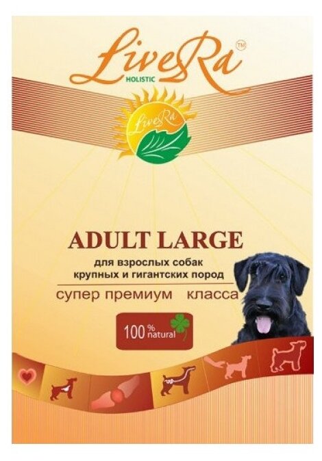 Лучшие цены. LiveRa ADULT LARGE - легко усваиваемый, полноценный рацион для взрослых собак крупных и гигантских пород, основанный на натуральных компонентах с добавлением необходимых витаминов и минералов. Сбор трав входящий в состав корма улучшает работу желудочно-кишечного тракта, поддерживает иммунитет способствует улучшению качества шерсти и состоянию кожи. Хондроитина сульфат, входящий в состав корма, как естественный компонент соединительной ткани, оказывает противовоспалительное и хондропротекторное действие на. Магазины в вашем городе.