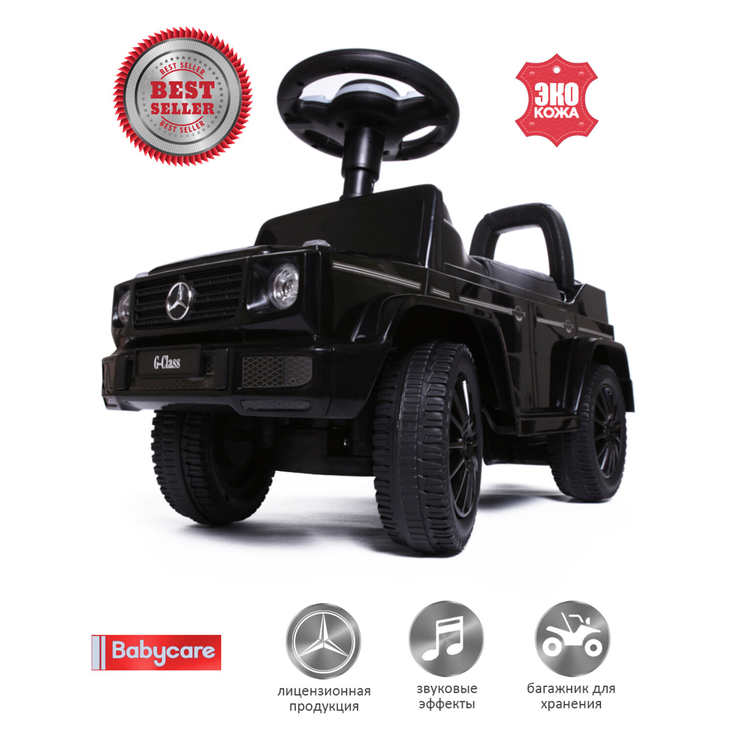 Лучшие цены. Каталка для детей от 1 до 4 лет, выпущенная по лицензии мирового автопроизводителя, точная копия Mercedes Benz G350. Ребенок может толкаться ногами и ехать самостоятельно. Характеристики: Музыкальный руль, звуковые эффекты (руль АА батарейки 2шт , звук клаксона/звук включения) (под сиденье АА батарейки 4шт, заводские мелодии/звук клаксона), батарейки в комплект не входят; Световые эффекты, нет (фары не светятся). Колеса пластик. Место для хранения есть. Сиденье пластик. Магазины в вашем городе.