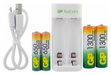 Зарядное устройство GP для аккумуляторных батареек АА и ААА, на 2 слота, с аккумуляторами AAA 650 mAh, АА 1300 мАч, набор 4 шт, с кабелем micro USB 849 ₽ Подробнее