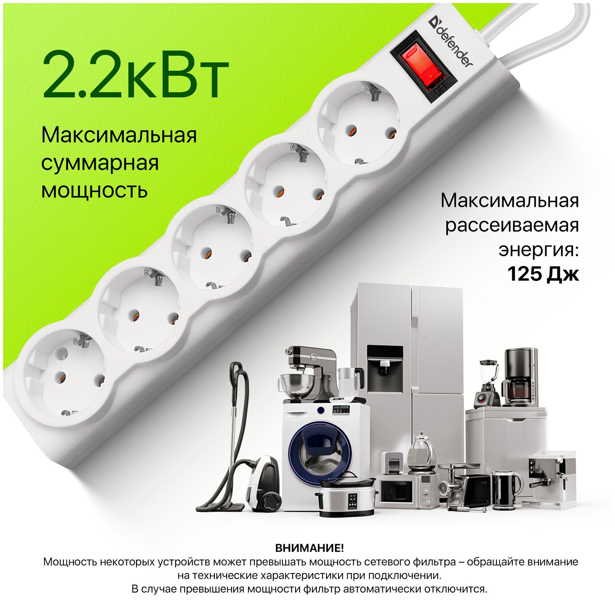 Сетевые фильтры и удлинители Сетевой фильтр DEFENDER PowerS 50, 5 розеток, ПВС 3*1,0 мм2, мощность 2200 Вт, ток 10А, белый, 5 м