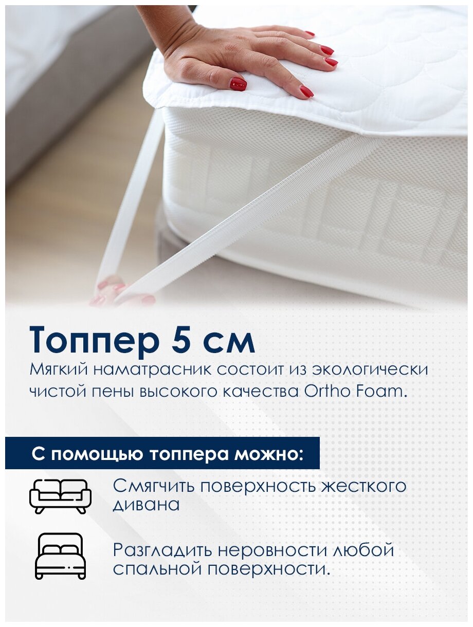 Лучшие цены. Матрасы для кровати / Матрас беспружинный / Топпер - это синоним к диванному матрасу. Данный вид изделия не сможет полноценно заменить матрас, но имеет ряд неоспоримых преимуществ: Защита поверхности спального места от появления пятен. Мягкий наматрасник состоит из экологически чистой пены высокого качества Ortho Foam отлично подойдет в качестве дополнительного мягкого слоя на Ваш диван или любую спальную поверхность. Магазины в вашем городе.