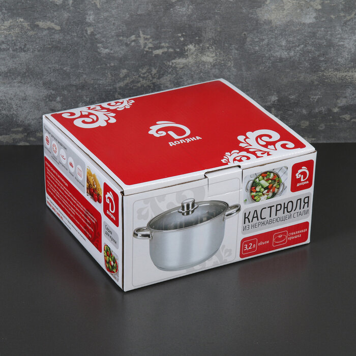 Кастрюля из нержавеющей стали Доляна «Гретте», 3,2 л, d=20 см, стеклянная крышка, капсульное дно, индукция