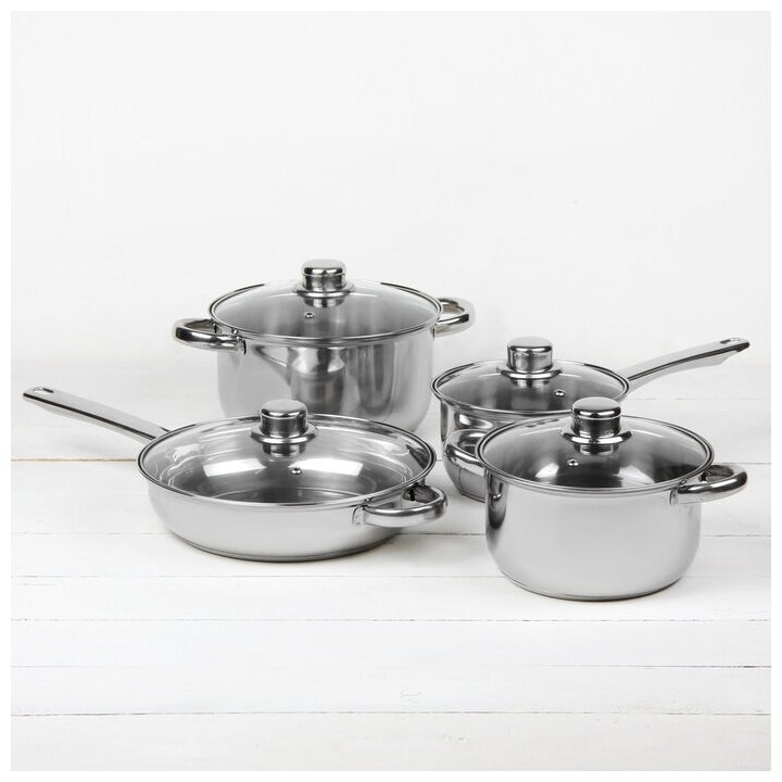 Набор посуды из нержавеющей стали Доляна «Классика», 8 предметов: ковш 1,5 л, 2 кастрюли 2/3 л, сковорода d=24 см, крышки, стенки 0,3 мм, дно 5 мм 7 456 ₽ Подробнее