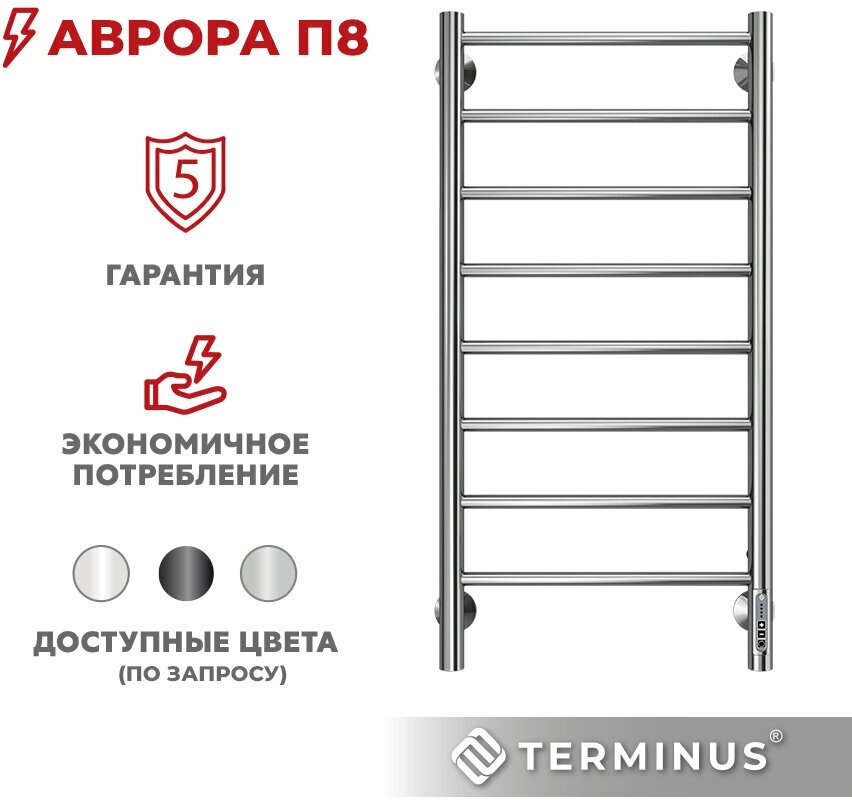 Полотенцесушитель электрический TERMINUS (Терминус) Аврора П8 400х850 мм, сверхпрочная пищевая нержавеющая сталь, диммер 5-ого поколения Quick Touch, гарантия 5 лет/ Электрический полотенцесушитель с терморегулятором