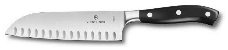 Лучшие цены. Нож сантоку VICTORINOX Grand Maître, кованый, рифлёное лезвие из нержавеющей стали 17 см, рукоять из полиоксиметилена чёрного цвета. Сантоку - это японский вариант кухонного ножа общего назначения. Он прекрасно подходит для нарезки, рубки и фаршировки; но его самый большой талант - разносторонность, а его истинная специализация - делать все хорошо. Благодаря особой форме и превосходному балансу, вы обнаружите, что сантоку является настоящим универсалом, которым приятно пользоваться изо дня в день. Магазины в вашем городе.